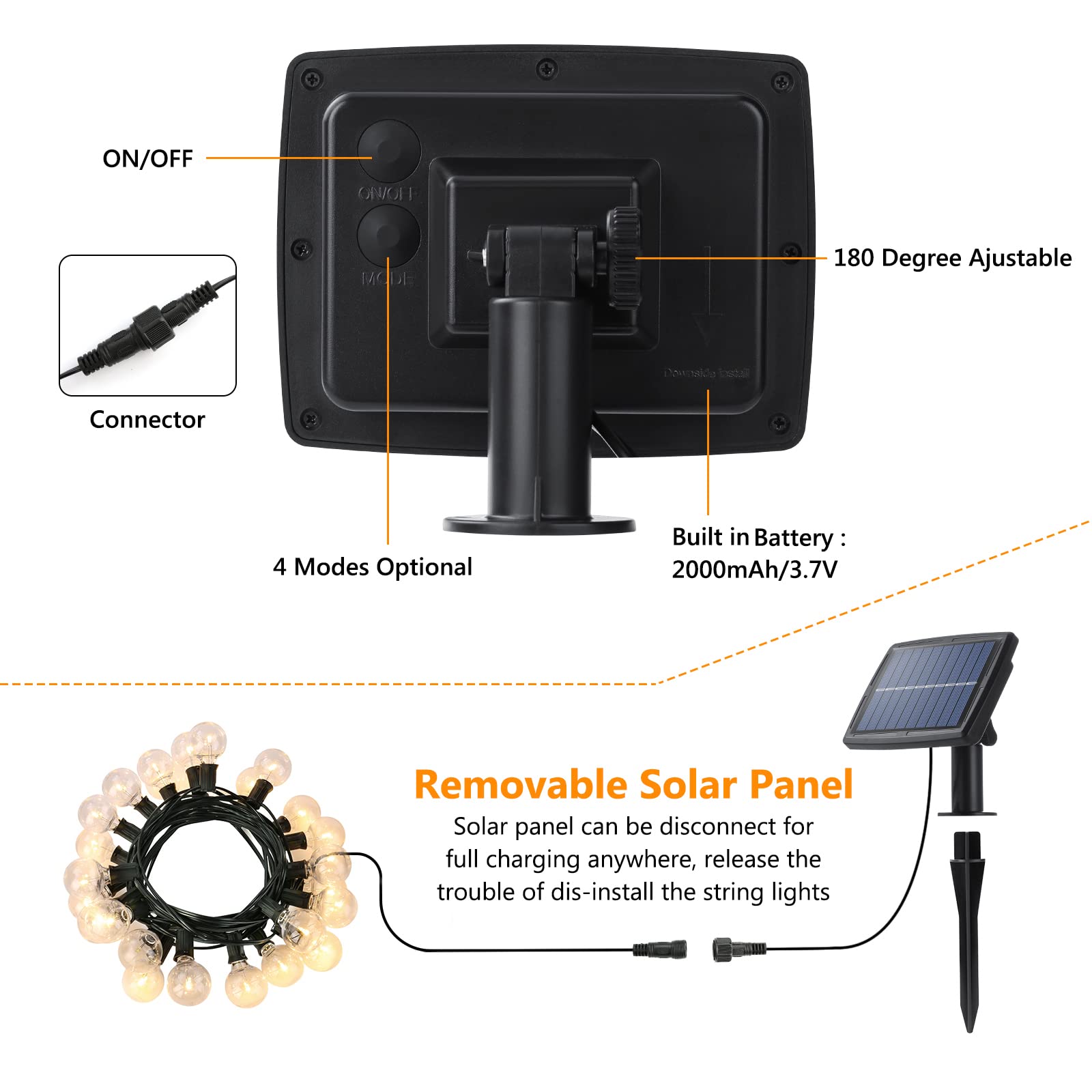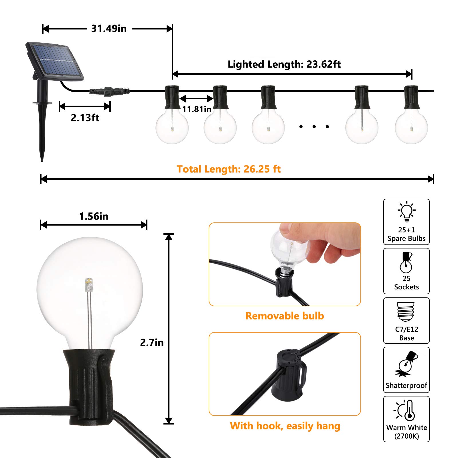 · 【Brighter LED bulbs & UpgradeSolar Panel】Our G40 solar string lights come with 25 LED bulbs and 1 spare bulb. Solar panel built-in high effective 2000mAh battery can work up to 12hrs when fully charged. 180-degree adjustable panel for optimal sun exposure. In addition, the panel can be disconnected for full charging anywhere, releasing the trouble of dis-install the string lights.