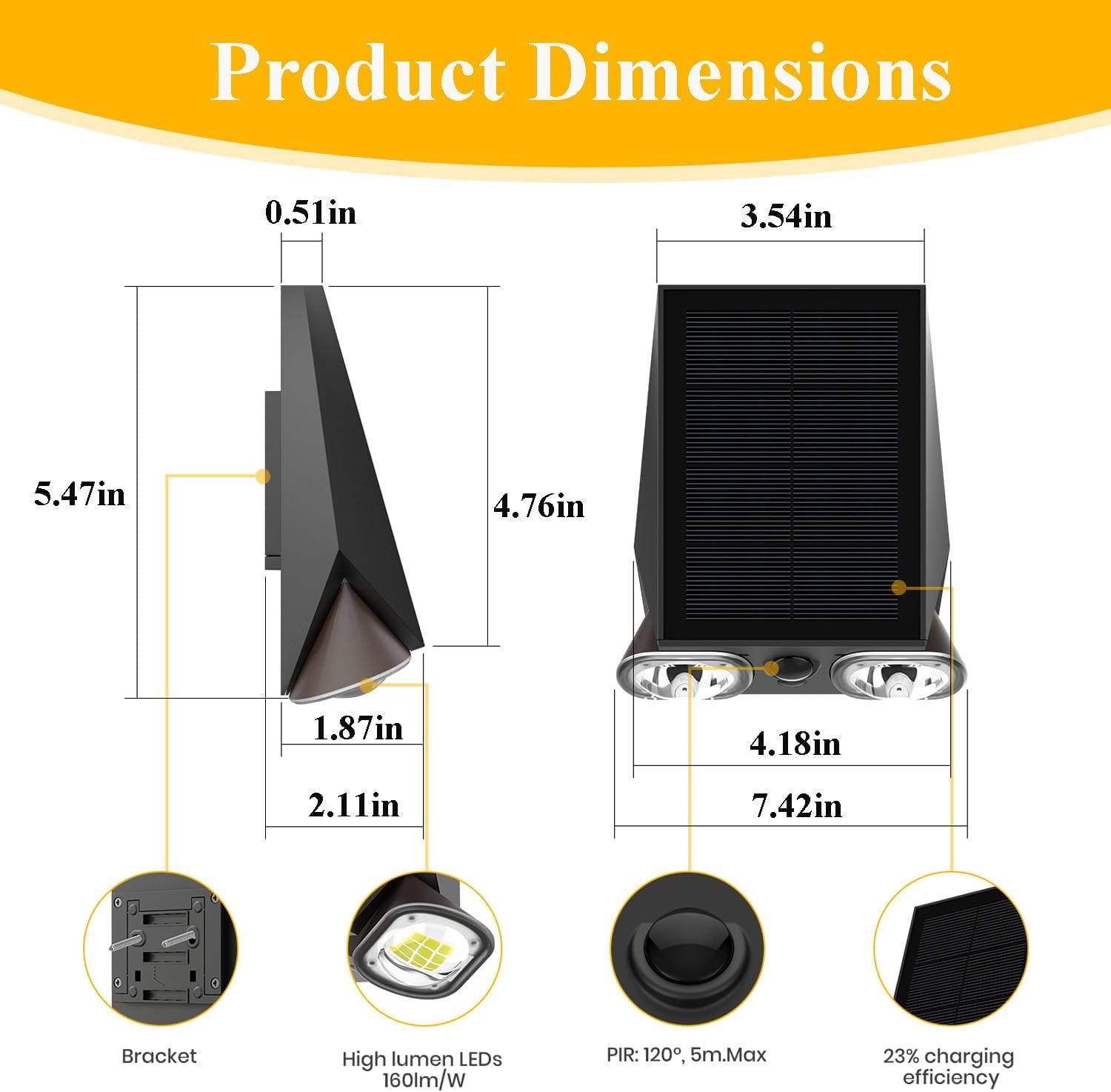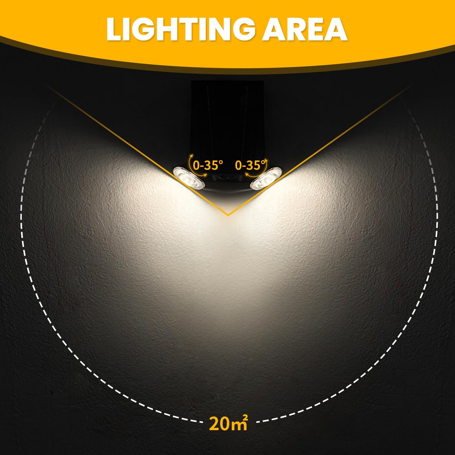 · Double Lamp Head Design: SUNUW solar wall lights outdoor have two led lamp head, 12pcs LEDs each for left/right lamp heads given 4000K natural white bright light. Adjustment angle range for each solar light head is 35°, flexible lighting angles based on your needs.