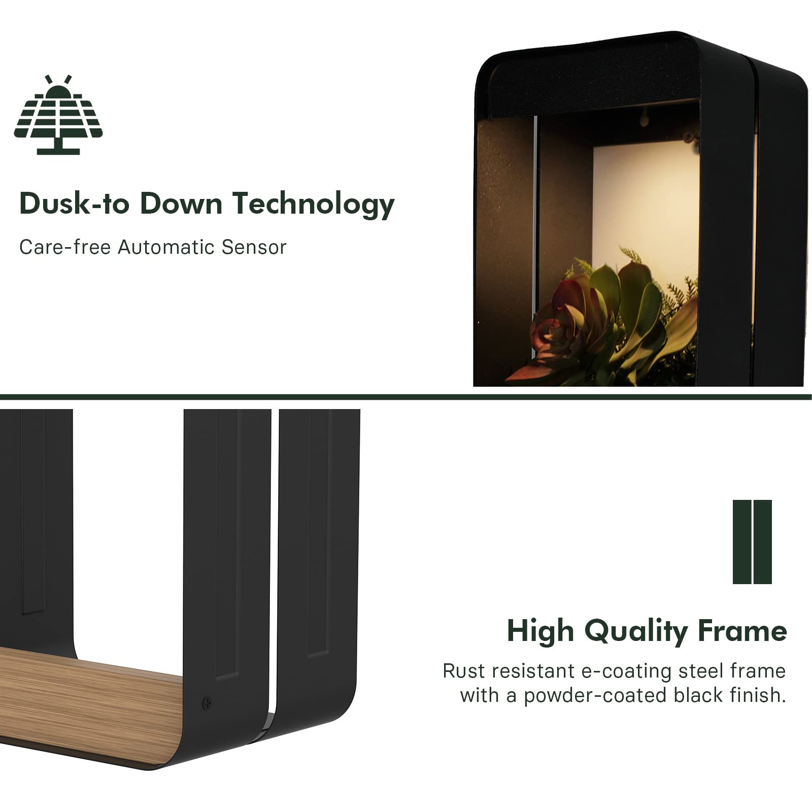 · MODERN STYLE: The simple geometric frame is perfect for adding a modern and stylish touch to your garden, this hanging solar wall planter is ideal for showcasing your favourite plants or accents.